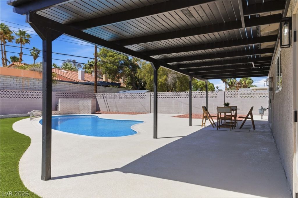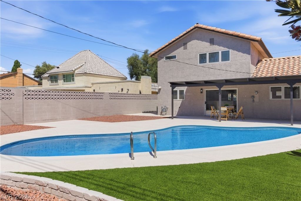 Conveniently located with quick access to Interstate 15 and less than 10 minutes from the world-class entertainment, dining, and casinos of Downtown Las Vegas and the Las Vegas Strip! This beautifully updated 2-story home features 3 bedrooms and a spacious backyard complete with a covered patio and in-ground pool?perfect for outdoor living and entertaining. Inside, the home offers abundant natural light and an open-concept floor plan enhanced by custom light fixtures, a tiled fireplace, plush carpeting, and laminate wood flooring throughout. The upgraded kitchen showcases garden views, recessed lighting, shaker-style cabinetry with modern hardware, custom countertops, stainless steel appliances, floating shelves, tiled backsplash, & a breakfast bar w/seating. Spa-inspired bathrooms feature dual vanities with framed mirrors, upgraded lighting, and modern tiled showers with built-in niches & rainfall shower heads. Move-in ready and designed for comfort and style?this home is a must-see!