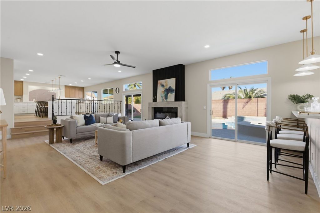 Enjoy the stunning remodeled, 2-story home featuring 6 bed. loft & a basement, nestled within the sought after gated community of Coronado Ranch. Designed for elevated living and refined entertaining, the property offers a private backyard w/ a covered patio, in-ground pool & spa, a 3-car garage, balcony & elegant custom-paved driveway. The interior is filled w/natural light, showcases vaulted ceilings, chandeliers, modern lighting, tiled fireplaces, custom built-ins, and a wet bar w/seating. Plush carpeting & laminate wood flooring create a seamless blend of comfort and contemporary style. The kitchen is a true centerpiece with custom oak cabinetry, quartz countertops, premium stainless steel appliances, recessed lighting, a cooktop w/ garden views, and a waterfall-edge island. Spa-inspired baths feature dual vanities, framed mirrors, modern lighting, separate soaking tub in primary,custom-tiled showers w/built-in niches & rainfall shower heads. Beautifully finished & move-in ready!